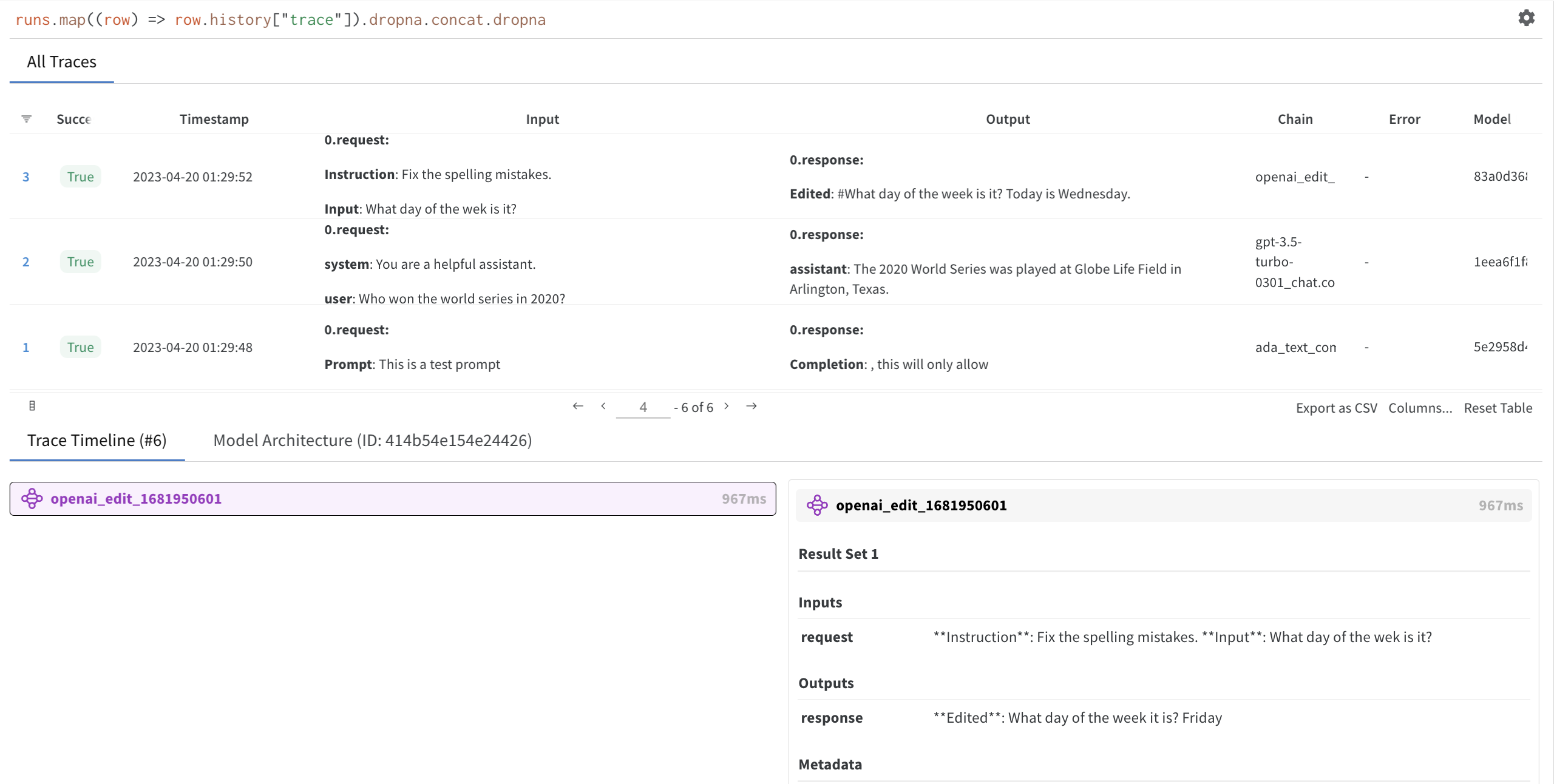 作成したrunを選択して、トレーステーブル、トレースタイムライン、および使用されたOpenAI LLMのモデルアーキテクチャを表示します。